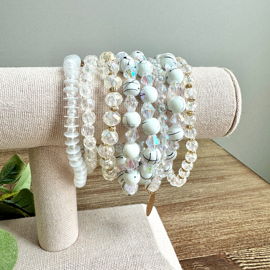 Bracelet Stackable Assorted Stone Beaded Set - White & Gold