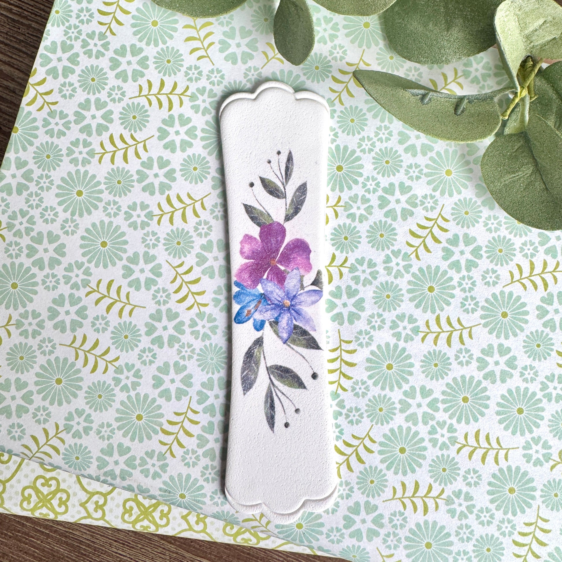 Made using polymer clay, design is created using transfer paper, then texture is applied to the top surface sealing the design to the clay after baking.