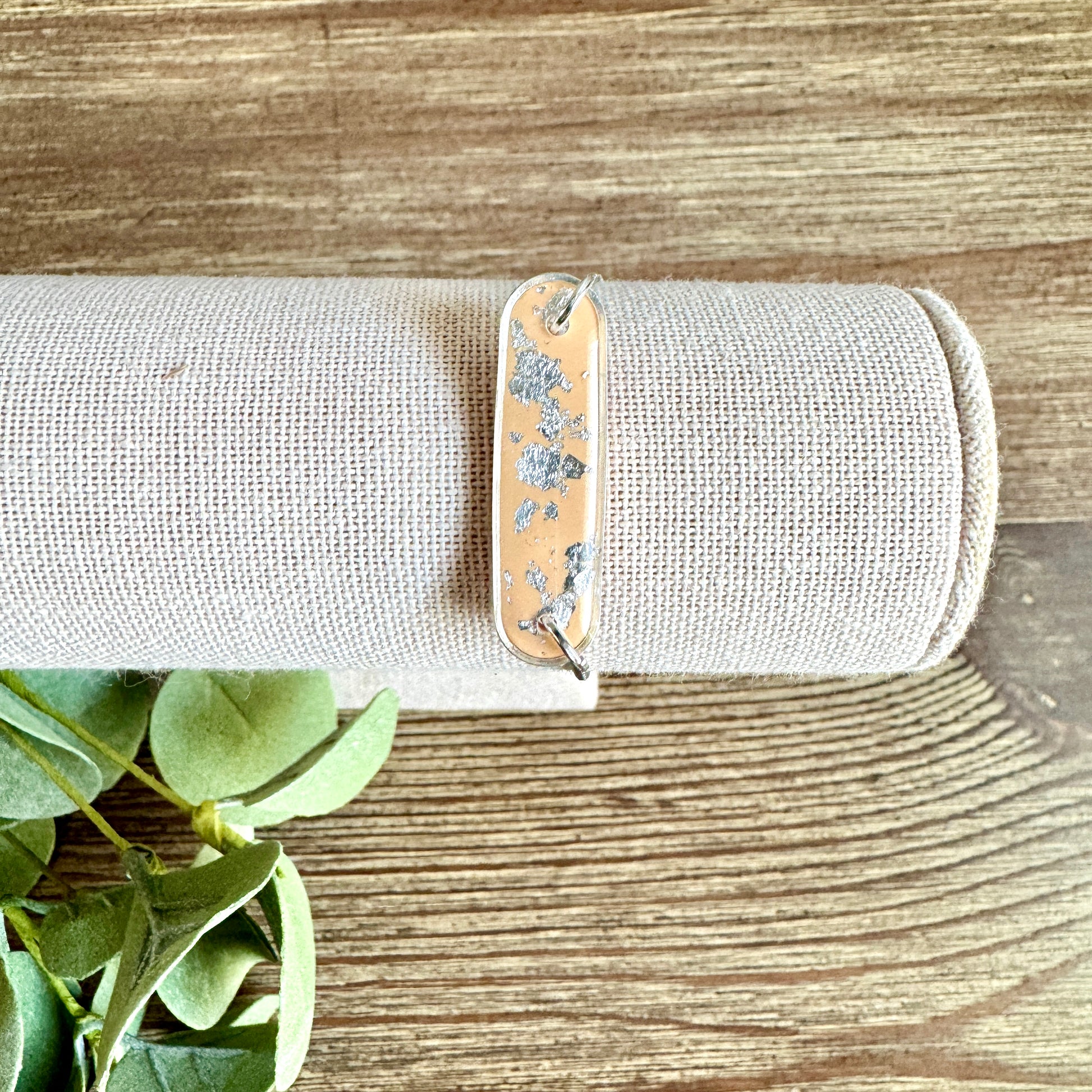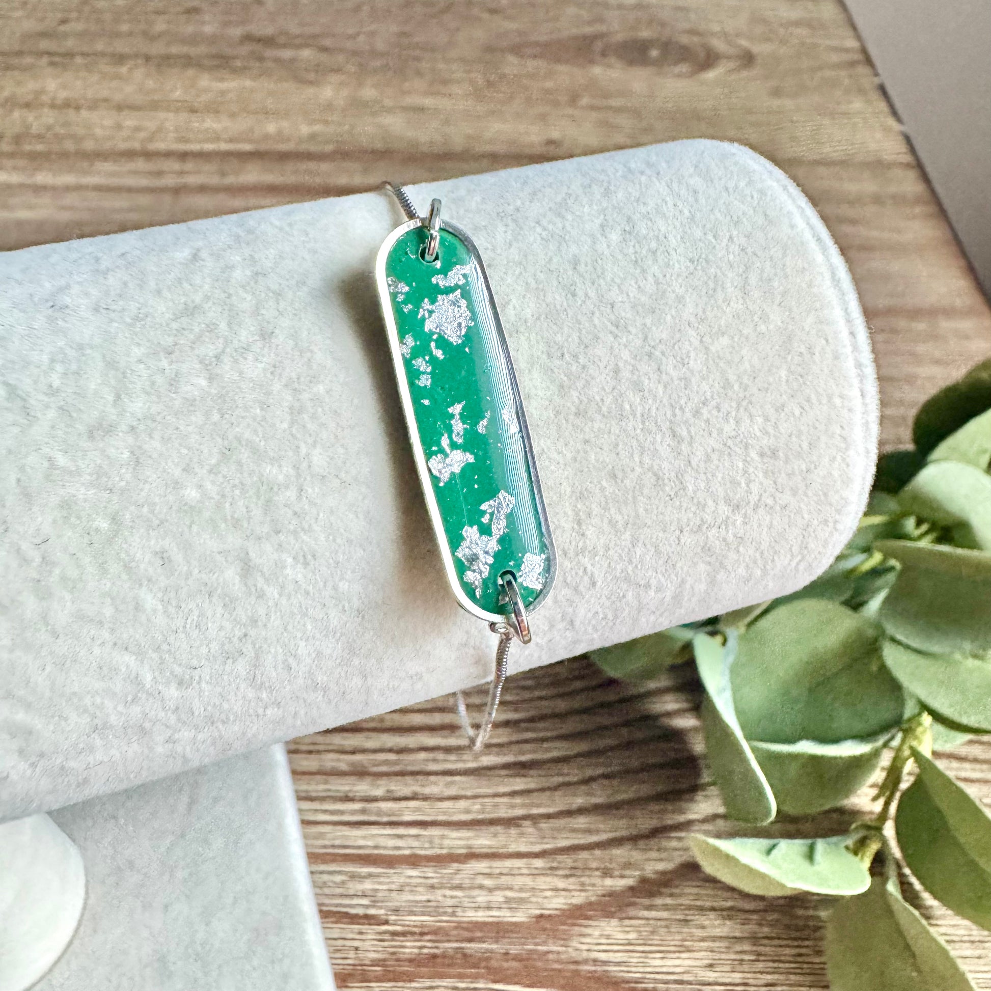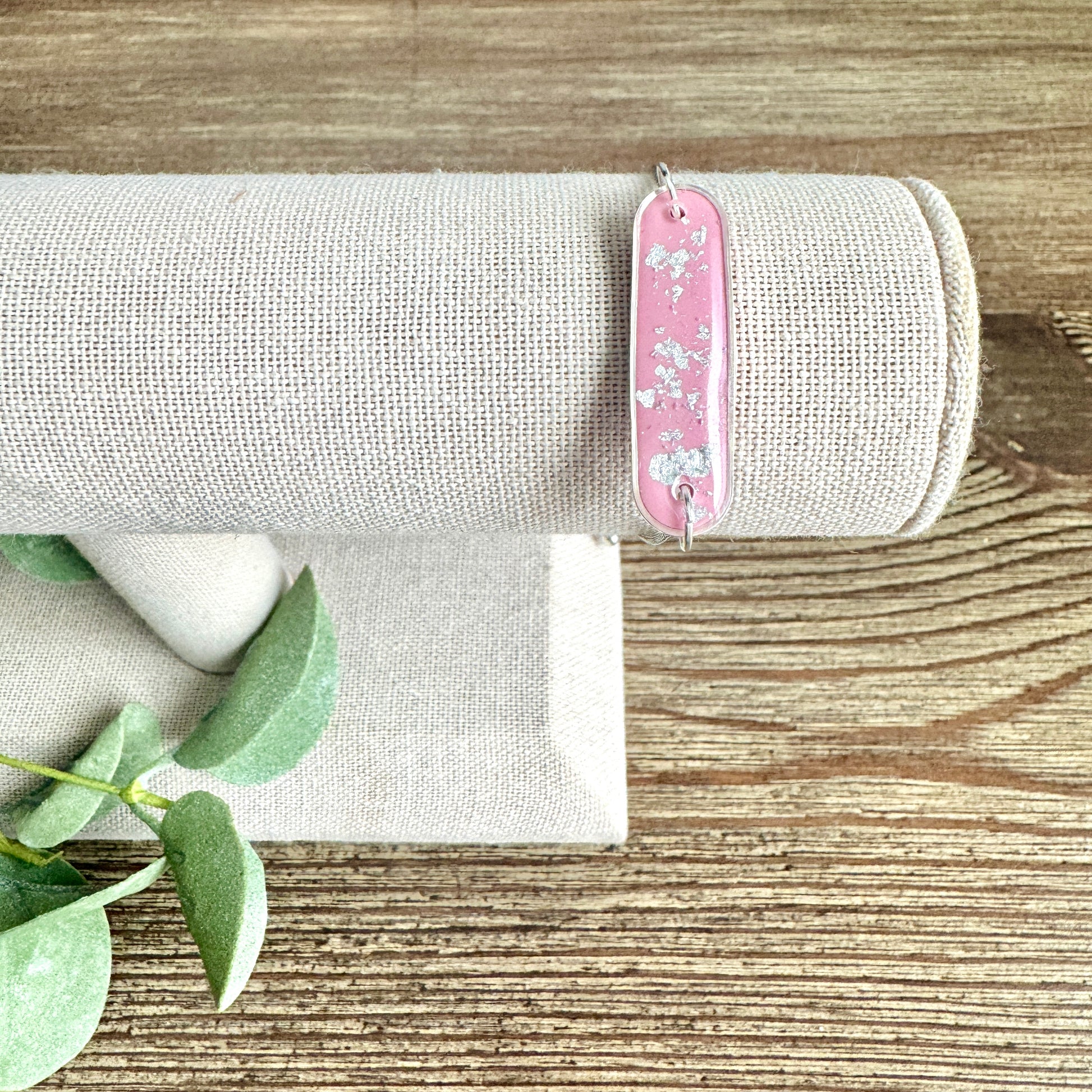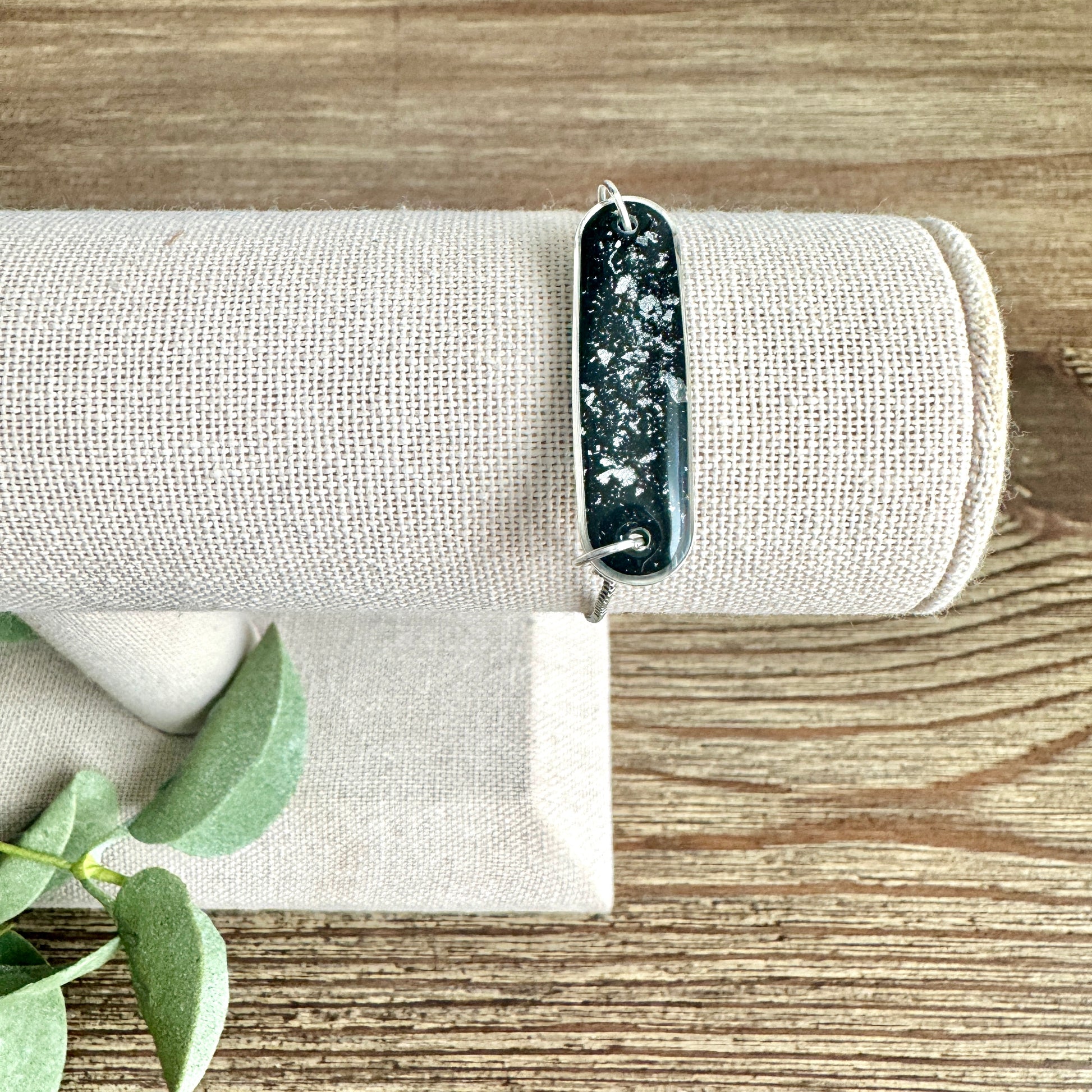 All bracelets are adjustable, silver plated with stainless base material. Polymer clay insert with resin finish.