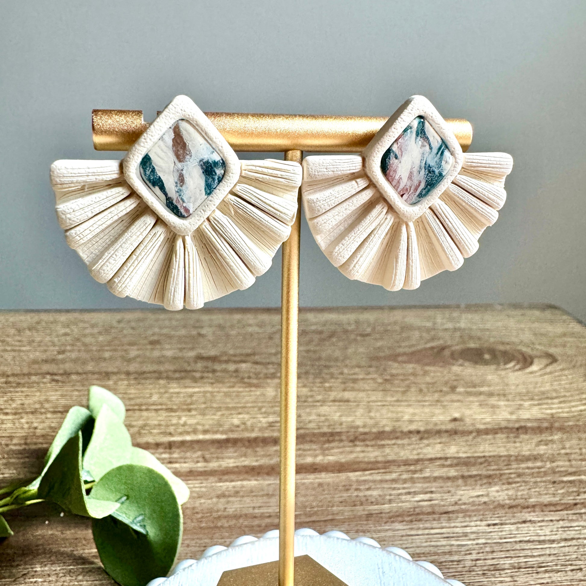 Earrings are handcrafted and are made to be sisters not twins. Earring posts are plated 18k gold with a base material of surgical steel. Polymer Clay is very lightweight so the earrings are not heavy on your ears.