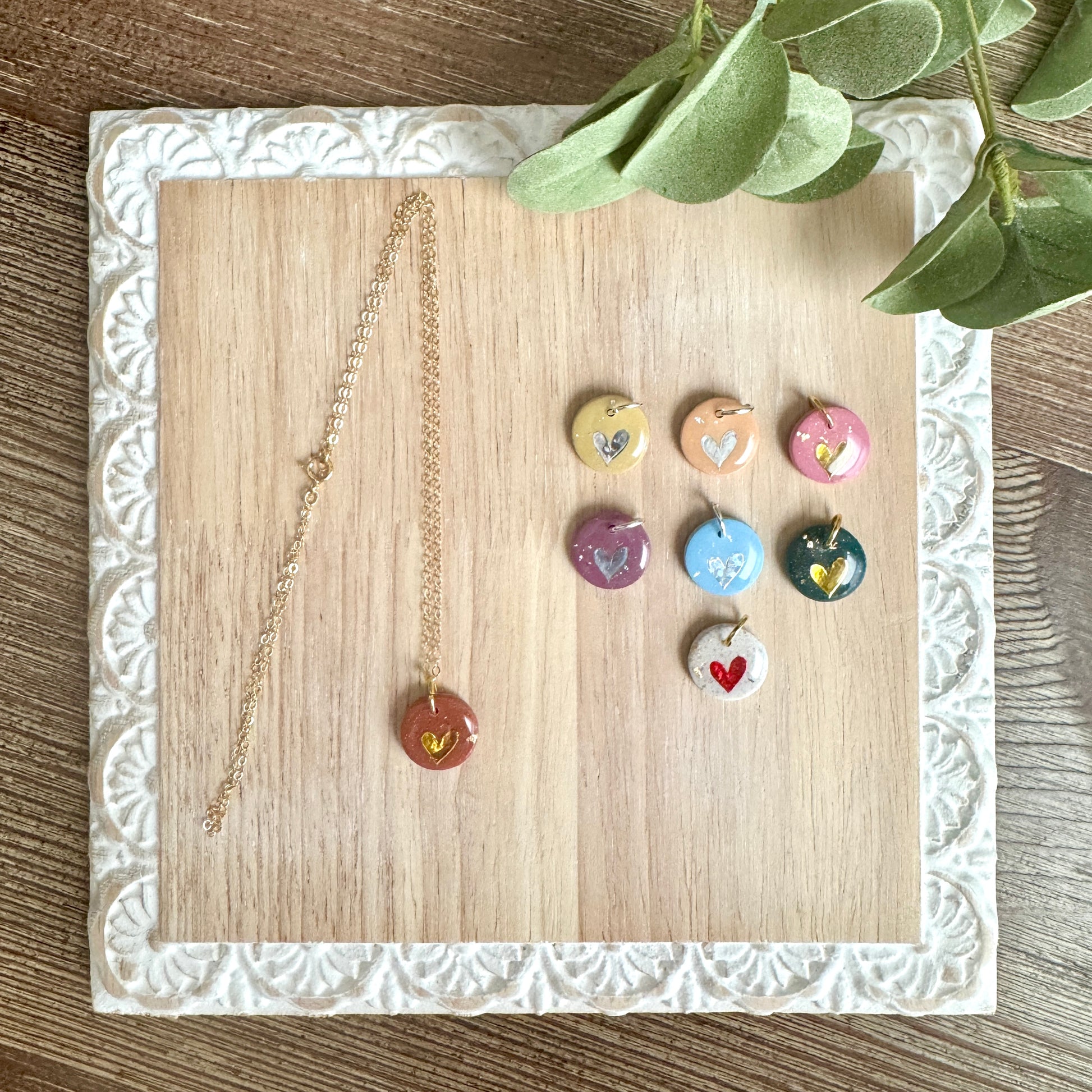 Gold Filled or Sterling Silver 18" Chain Necklace with Round Polymer Clay Charm. The charm will include a heart accent in either red, gold or silver. The charm is available in neutral, yellow, tangerine, red, pink, purple, light blue, and dark teal.