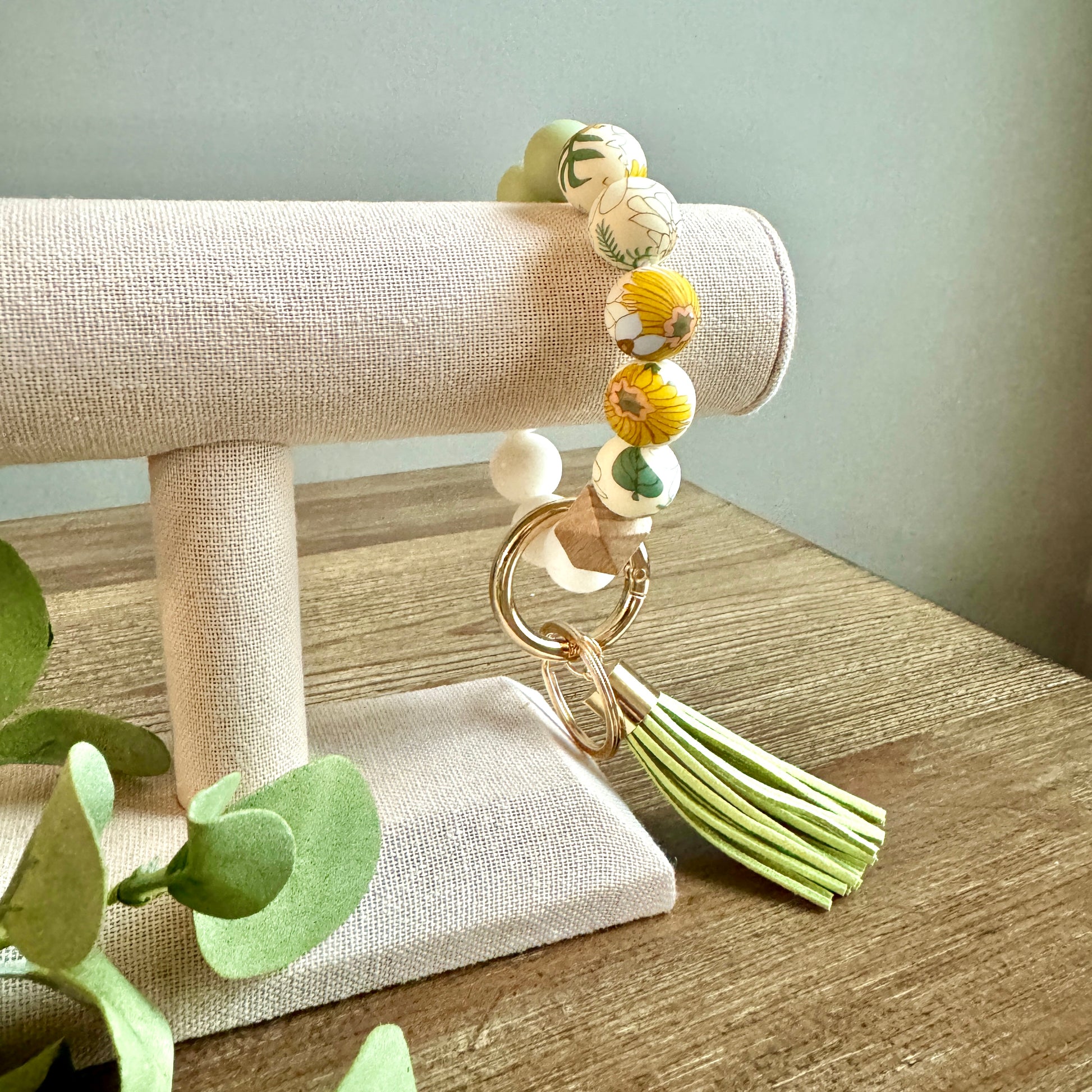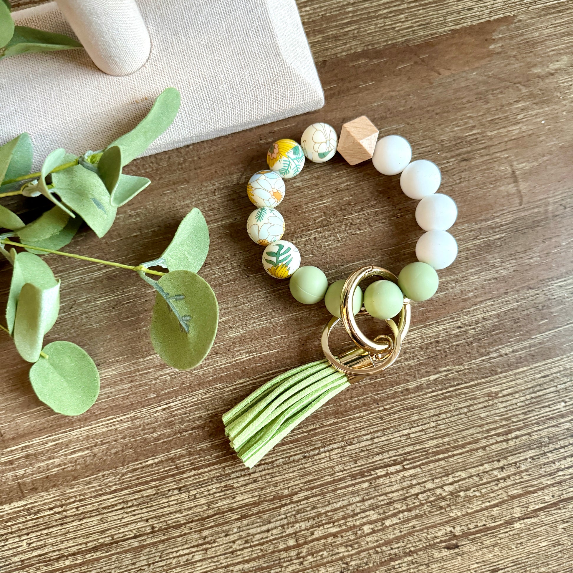 Silicone Beads, with wood bead accent, gold hardware and matching colored tassel. Meant to hold keys and / or wallet.