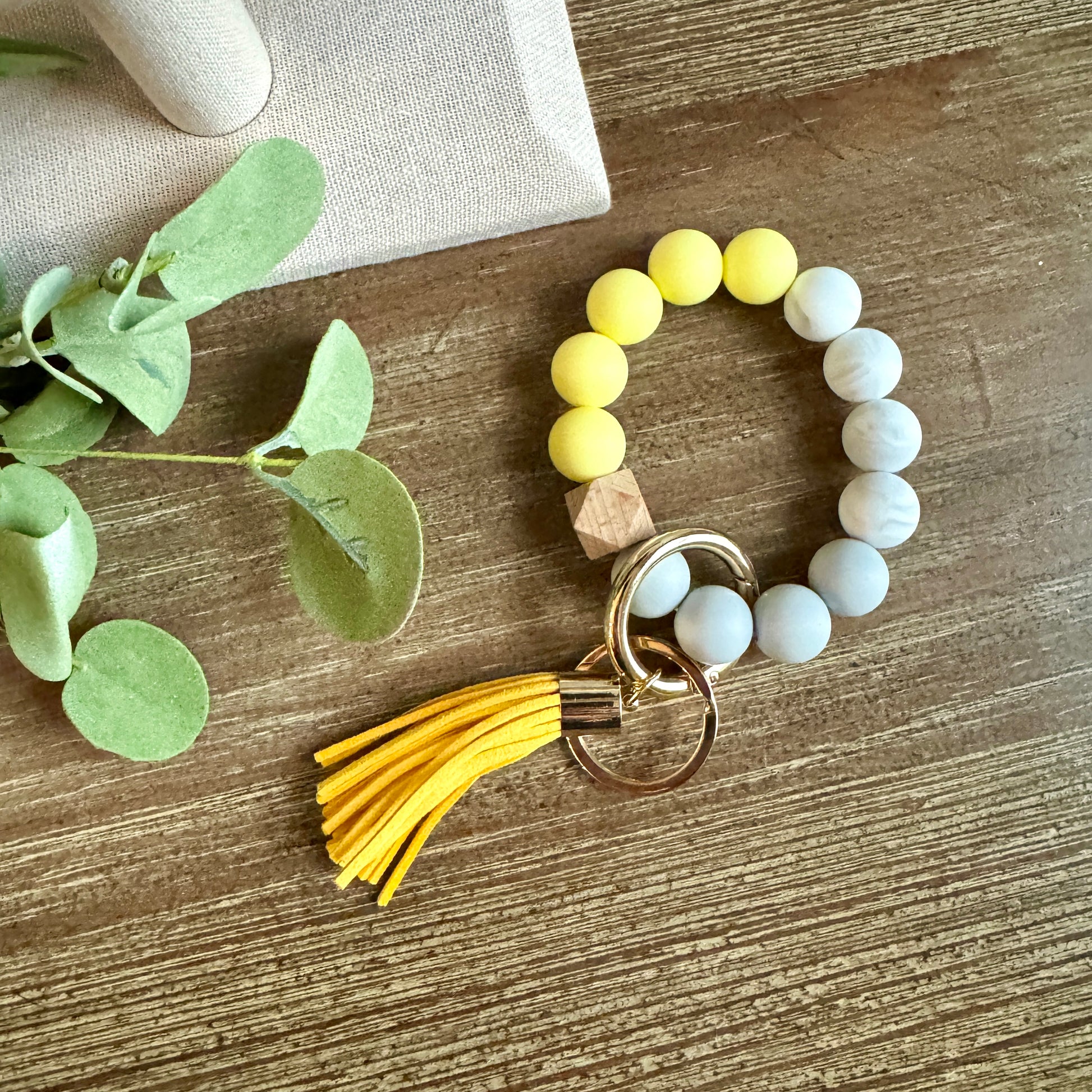 Silicone Beads, with wood bead accent, gold hardware and matching colored tassel. Meant to hold keys and / or wallet.