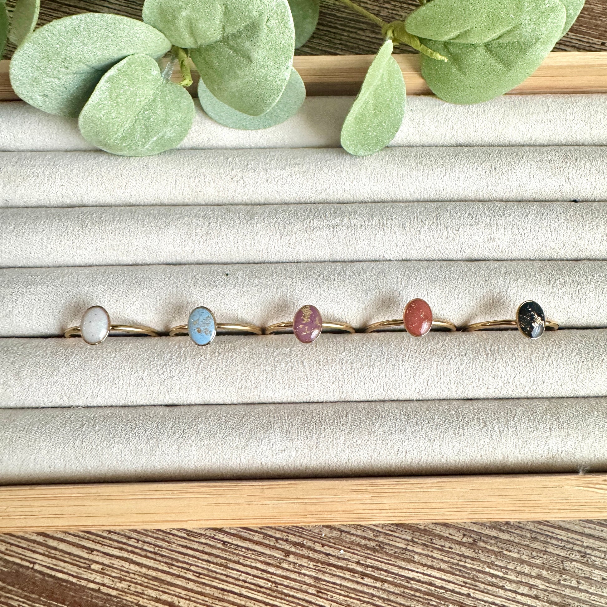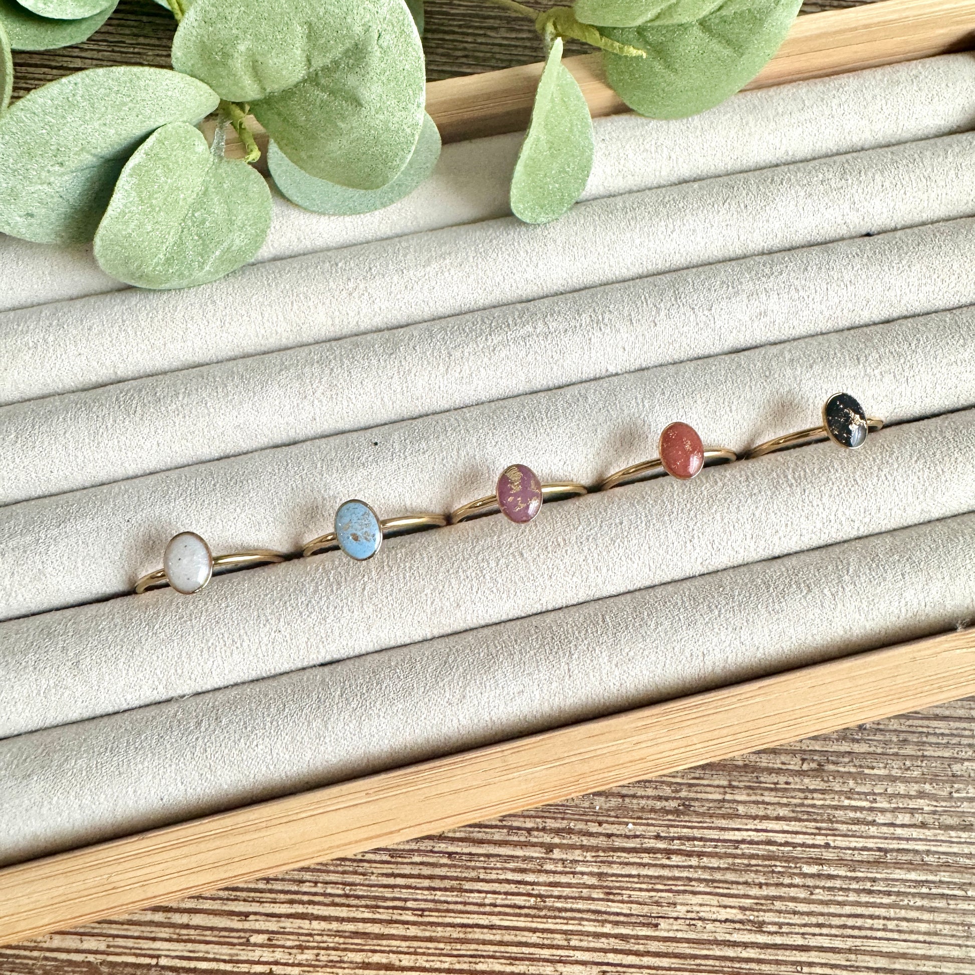 All rings are adjustable, gold plated with stainless base material. Polymer clay insert with gold details and finished with resin on top for shinny appearance.