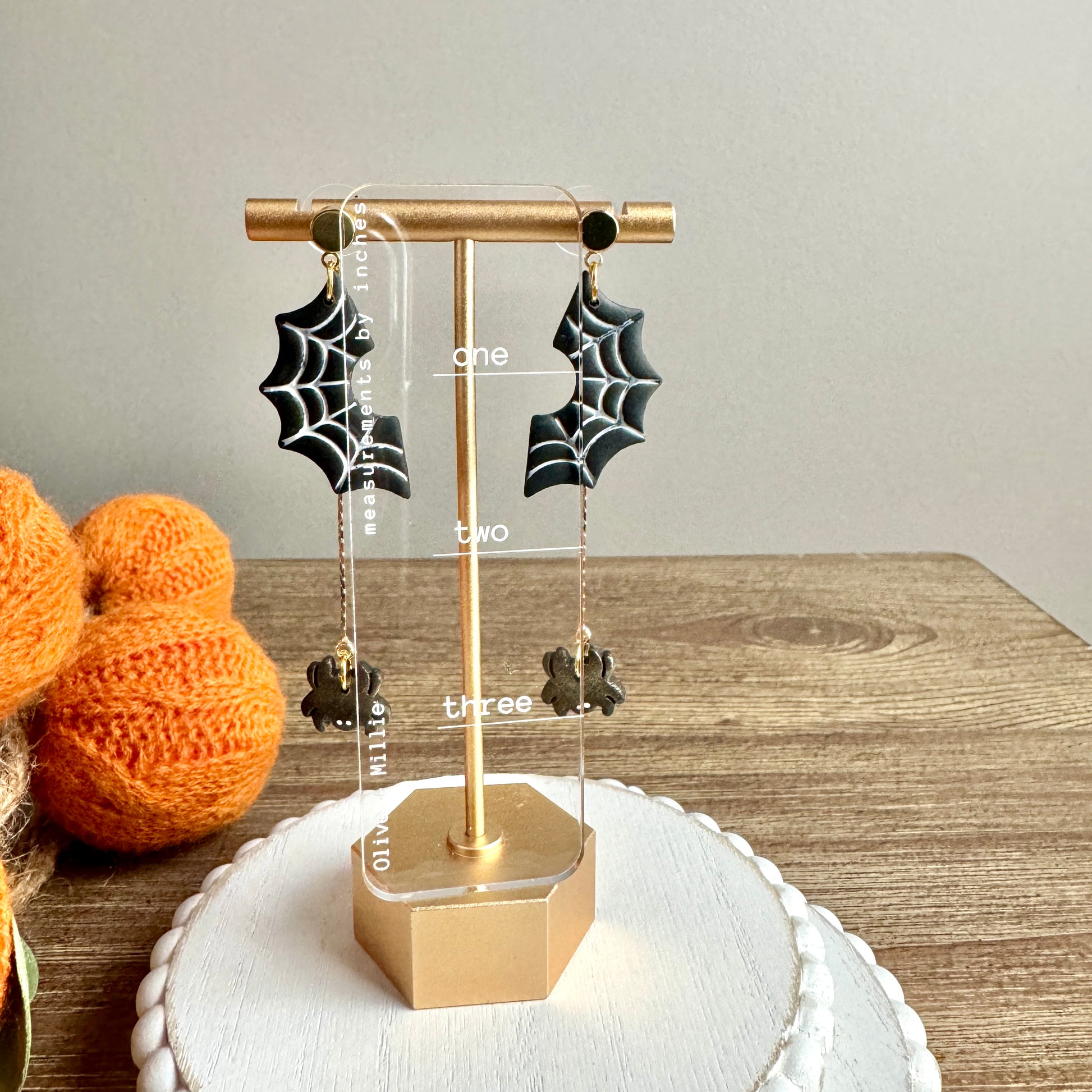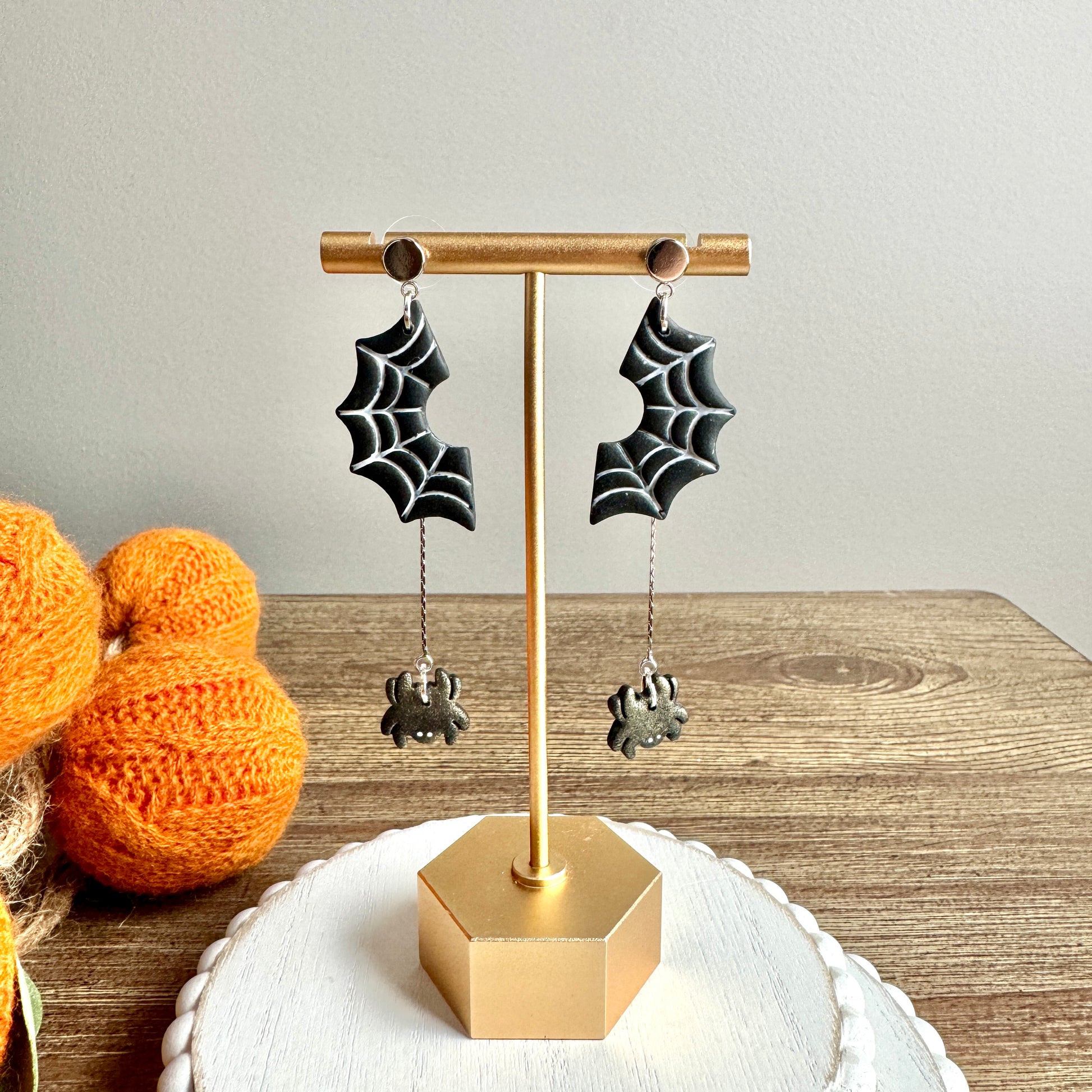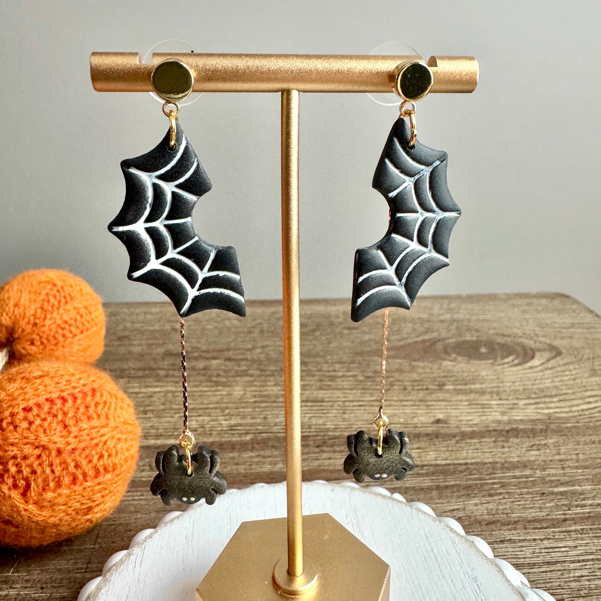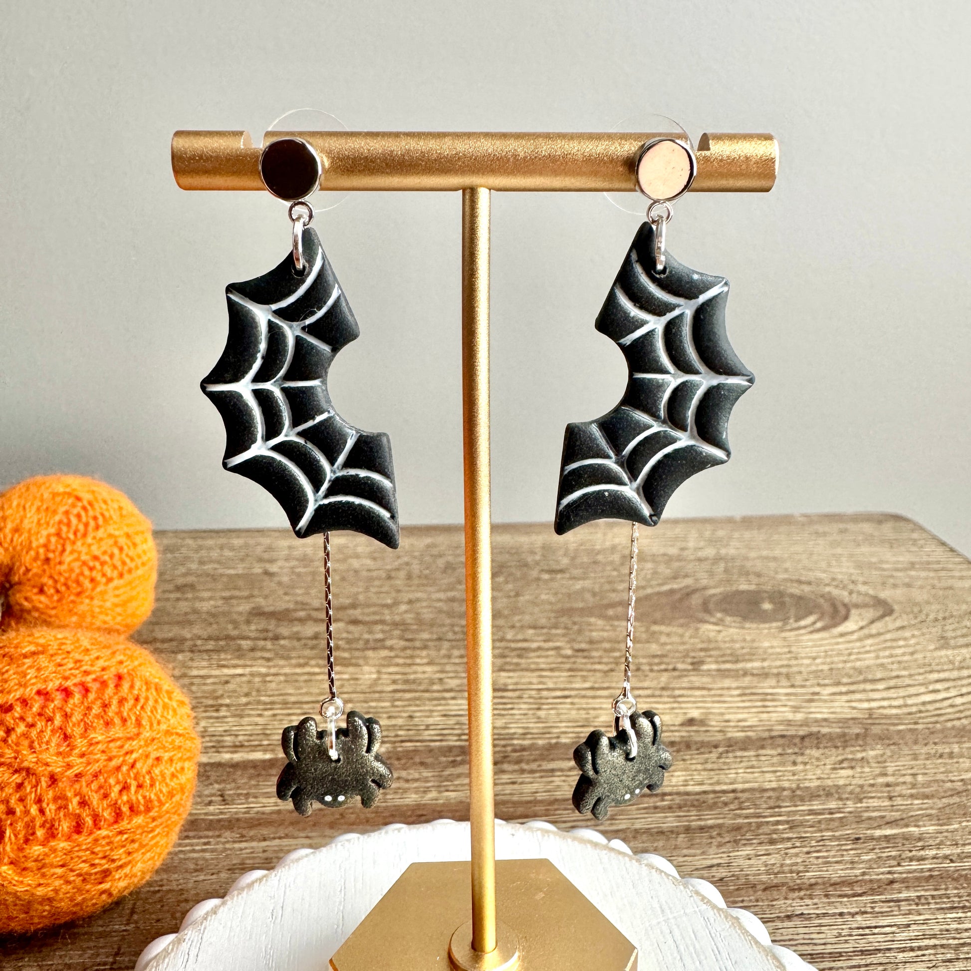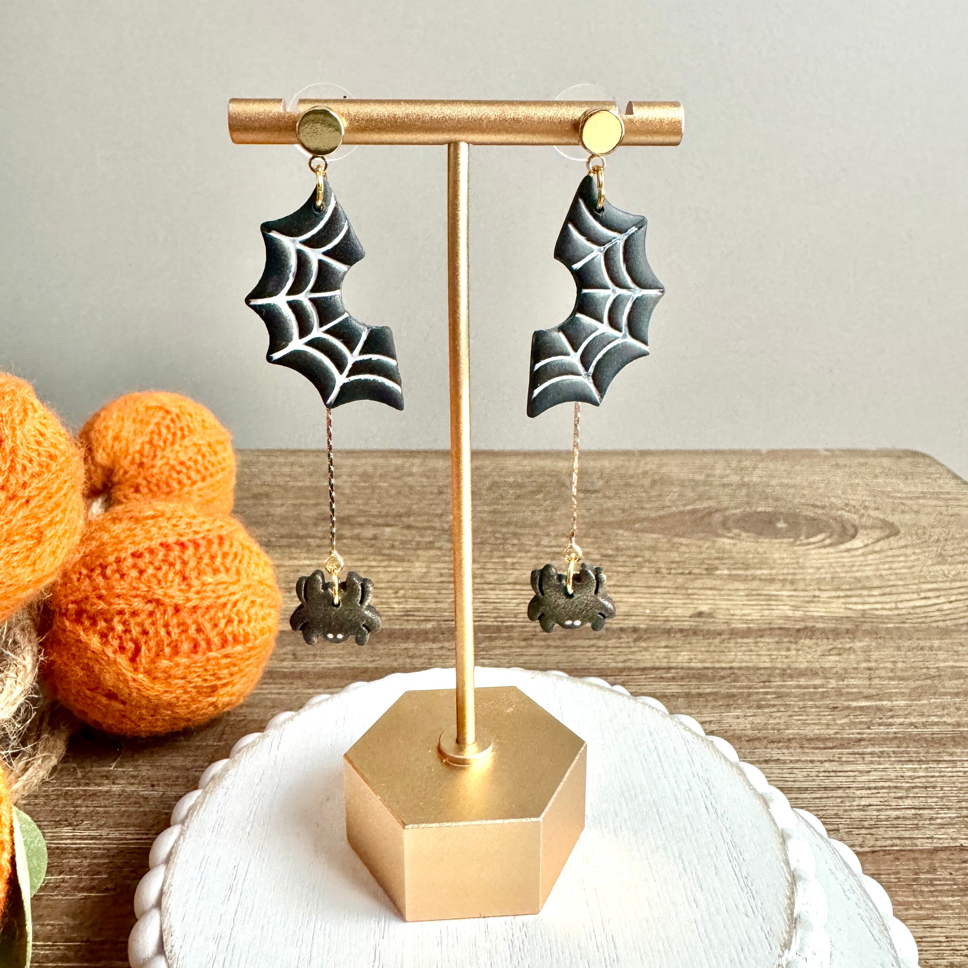 Available in gold or silver, with a chain connecting the spider charm to the earring post.